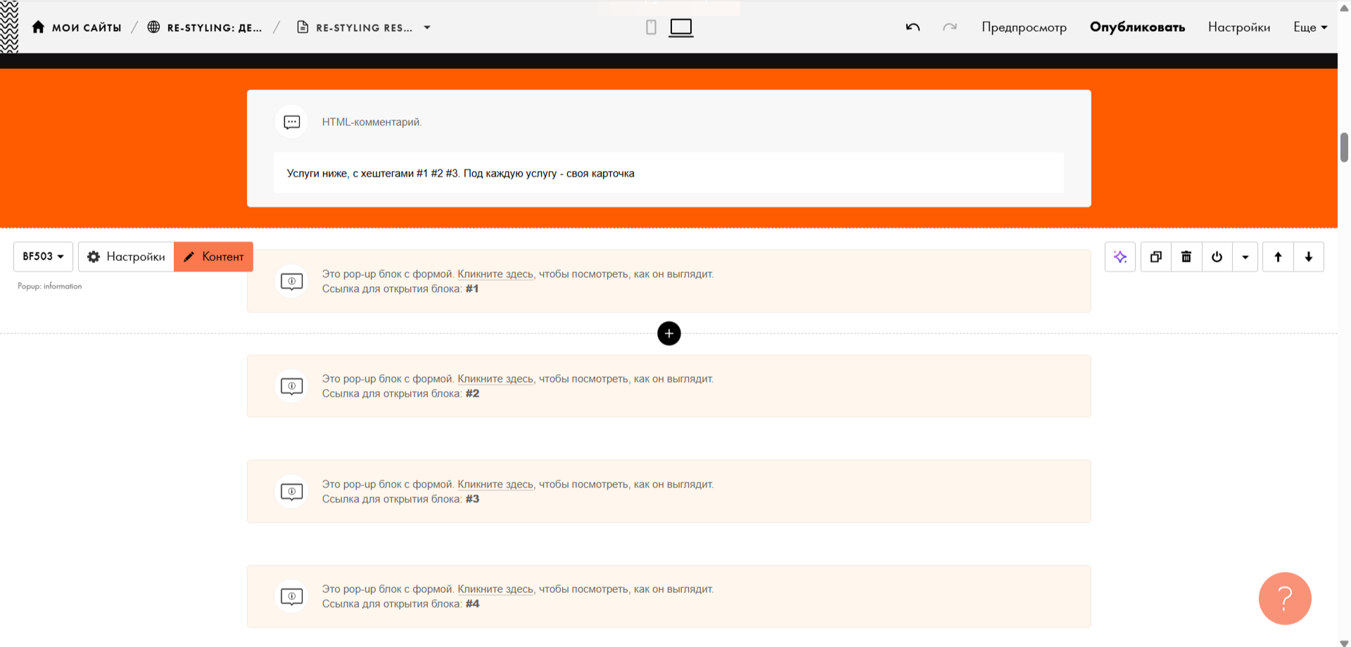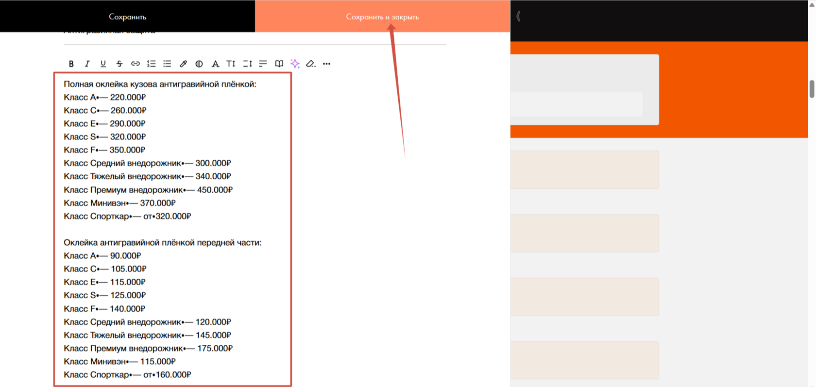 3) Пролистываем страницу вниз и находим нужный блок, в котором хочется заменить цены. Обратите внимание, в данном случае под каждую услугу отдельный "блок".