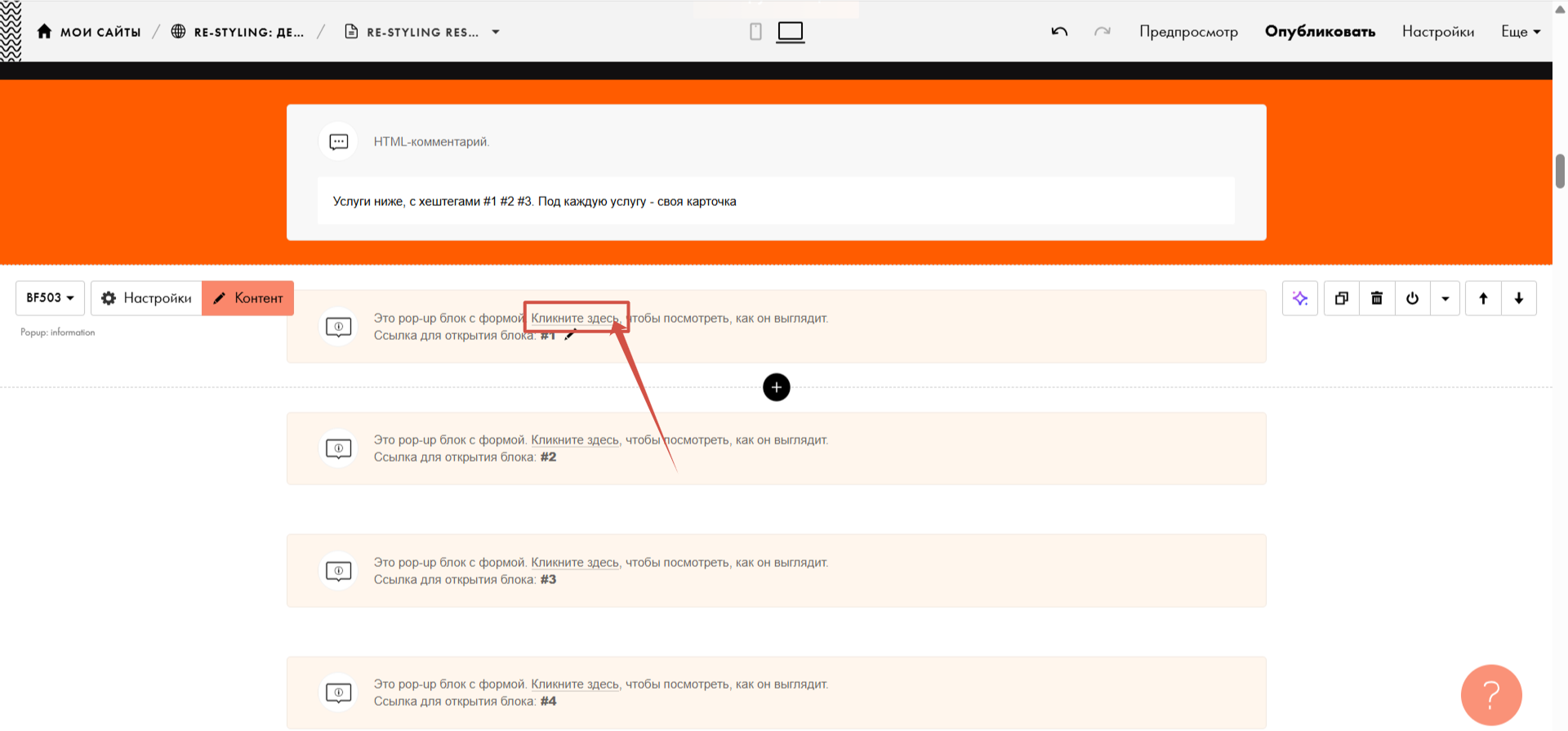 Блок нашли - жмем на кнопку Контент